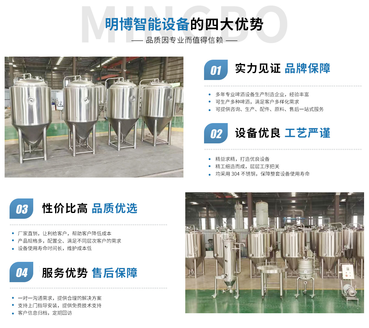 安徽明博智能設(shè)備有限公司位于安徽省宿州市宿馬園區(qū)馬鋼機(jī)械園2號廠房;我司擁有制造多年不銹鋼設(shè)備行業(yè)經(jīng)驗(yàn),主推生產(chǎn)大中小型精釀啤酒設(shè)備、果酒設(shè)備、啤酒實(shí)驗(yàn)設(shè)備、和提供釀酒技術(shù)支持的生產(chǎn)廠家。 公司經(jīng)營范圍具體包含:食品、酒、飲料及茶生產(chǎn)專用設(shè)備制造;日用化工專用設(shè)備制造;制藥專用設(shè)備制造;環(huán)境保護(hù)專用設(shè)備制造;智能基礎(chǔ)制造裝備制造;金屬結(jié)構(gòu)制造;制冷、空調(diào)設(shè)備制造;氣體壓縮機(jī)械制造銷售等;我們是集設(shè)...